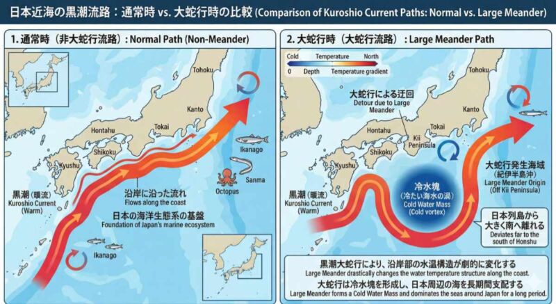 それこそが、2017年に発生し、日本の海を長きにわたって支配し続けた**「黒潮大蛇行」**です。