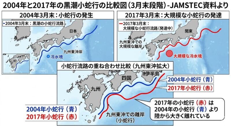 データを見ると、公式な大蛇行発生宣言は8月でしたが、なんと2017年3月末の段階で、すでに前回(2004年)の大蛇行時を上回る規模の巨大な「小蛇行」が発生し、発達を始めていたことが記録されています。