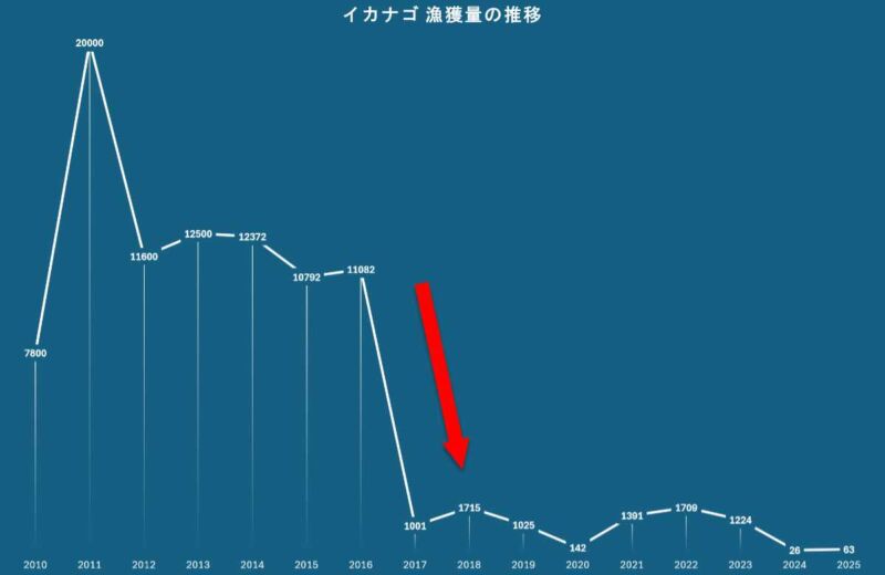 実は2017年前後を境に、イカナゴ以外の全く異なる海産物も、一斉に記録的な大不漁に陥っているのです。