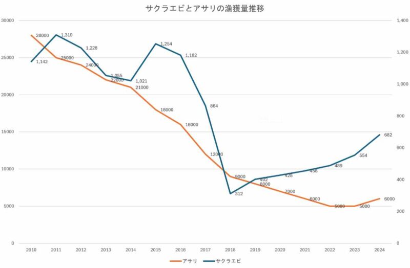 さらに、全国の砂泥底(海底)に生息し、古くから親しまれてきた「アサリ」も、長期的な減少傾向にはあったものの、2017年前後から一段と深刻な不漁へと落ち込んでいます。