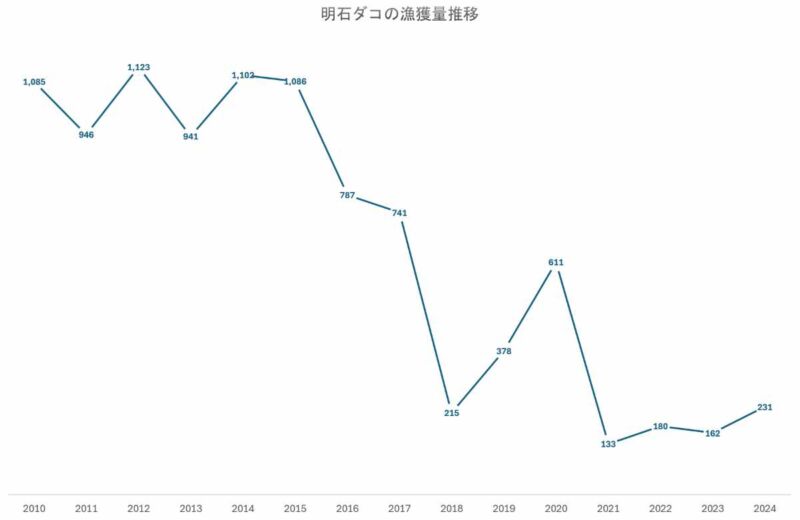 そして、当ブログがある兵庫県明石市の誇りであり、イカナゴと同様に地域の食文化を根底から支えてきた「明石ダコ」にも、目を疑うような激減が起きています。