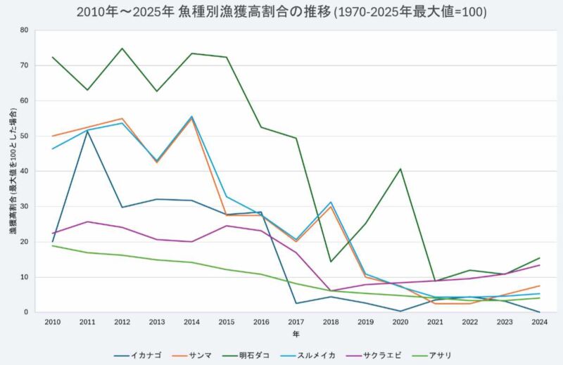 ここまで、イカナゴをはじめ、サンマ、スルメイカ、サクラエビ、アサリ、そして明石ダコといった多様な海産物が、「2017年前後」を境に一斉に激減している事実を見てきました。