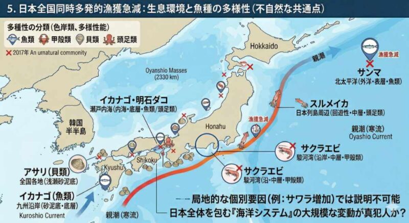 もしイカナゴの激減が「瀬戸内海だけの問題」であれば、捕食者の増加や局地的な水温変化だけで説明がつくかもしれません。しかし、これほど広範囲で、しかも生息域も生態も異なる多様な海産物が同時多発的に激減しているとなれば、別の巨大な要因を疑わざるを得ません。